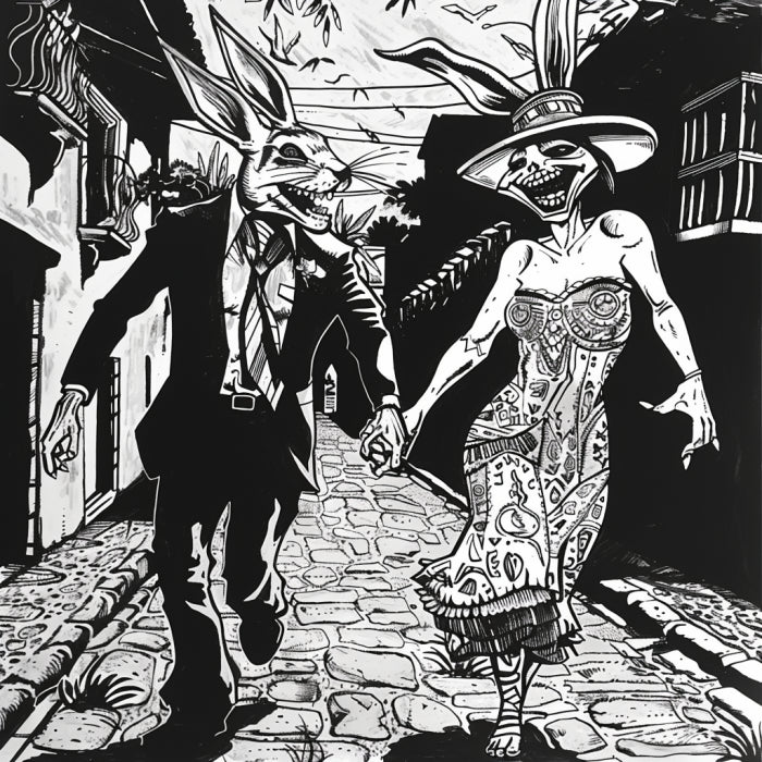 Off the Gulf Coast, you'll find Rabbit #77, known as the impulsive rabbit. When not working, he explores Tenochtitlan, in search of good times and unexpected sunrises after a night out. His taste for adventure drives him, often accompanied by his favorite juice, mezcal Espadín, throughout the evening. No matter where he roams, he easily makes friends and finds himself in circles that he just met. He has a knack for getting along with people and can persuade them into doing things they hadn't planned for. Insistent on having another drink, Rabbit #77 roams throughout the night, never staying in one place for too long. While he handles himself well most of the time, he tends to overindulge in drinking and takes unnecessary risks, resulting in bad situations. He sympathizes with Rabbit #251 but goes to great lengths to avoid her. He's infatuated with Rabbit #196.